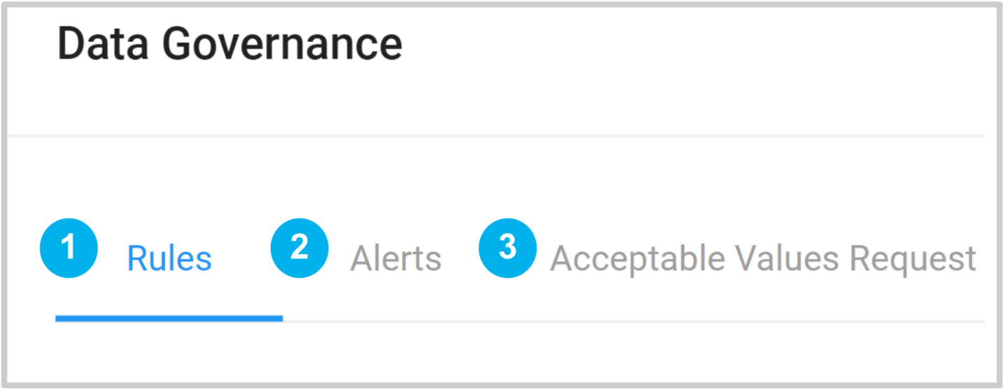 When accessing Data Governance as an Admin in Neodeluxe, you will notice there are three tabs: Rules, Alerts, and Acceptable Values Request. Each tab offers specific functionalities to manage Data Governance settings and requests. Here's an overview of each tab: