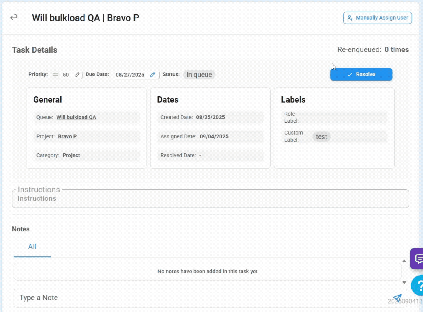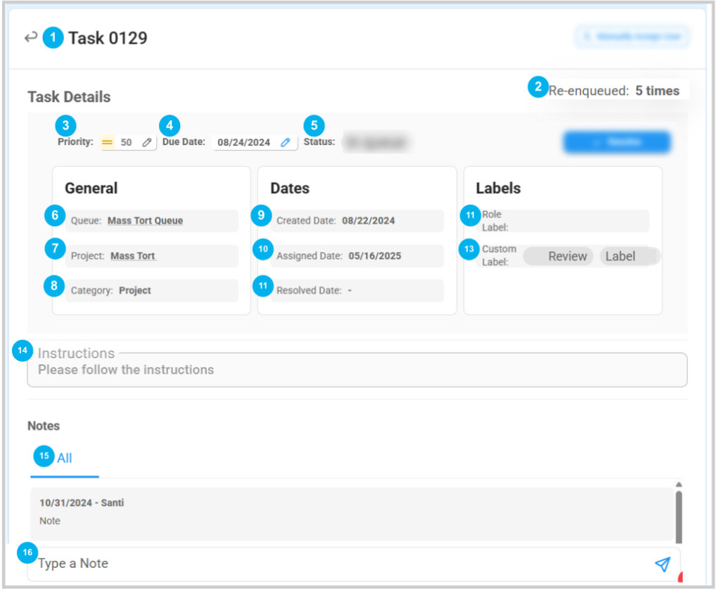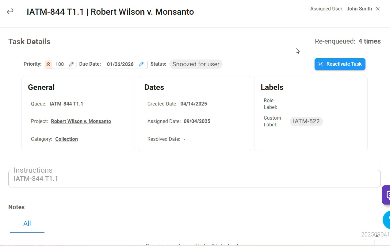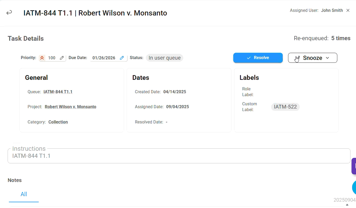 Shows how many times the task has been snoozed to the queue. | 🟢🔵🟡🟣🟤 | N/A | |