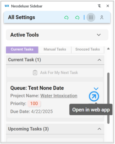 🟡🟣🟤 Users can view and manage only their currently assigned tasks, accessible through the Open in web app icon in the Neodeluxe Sidebar.