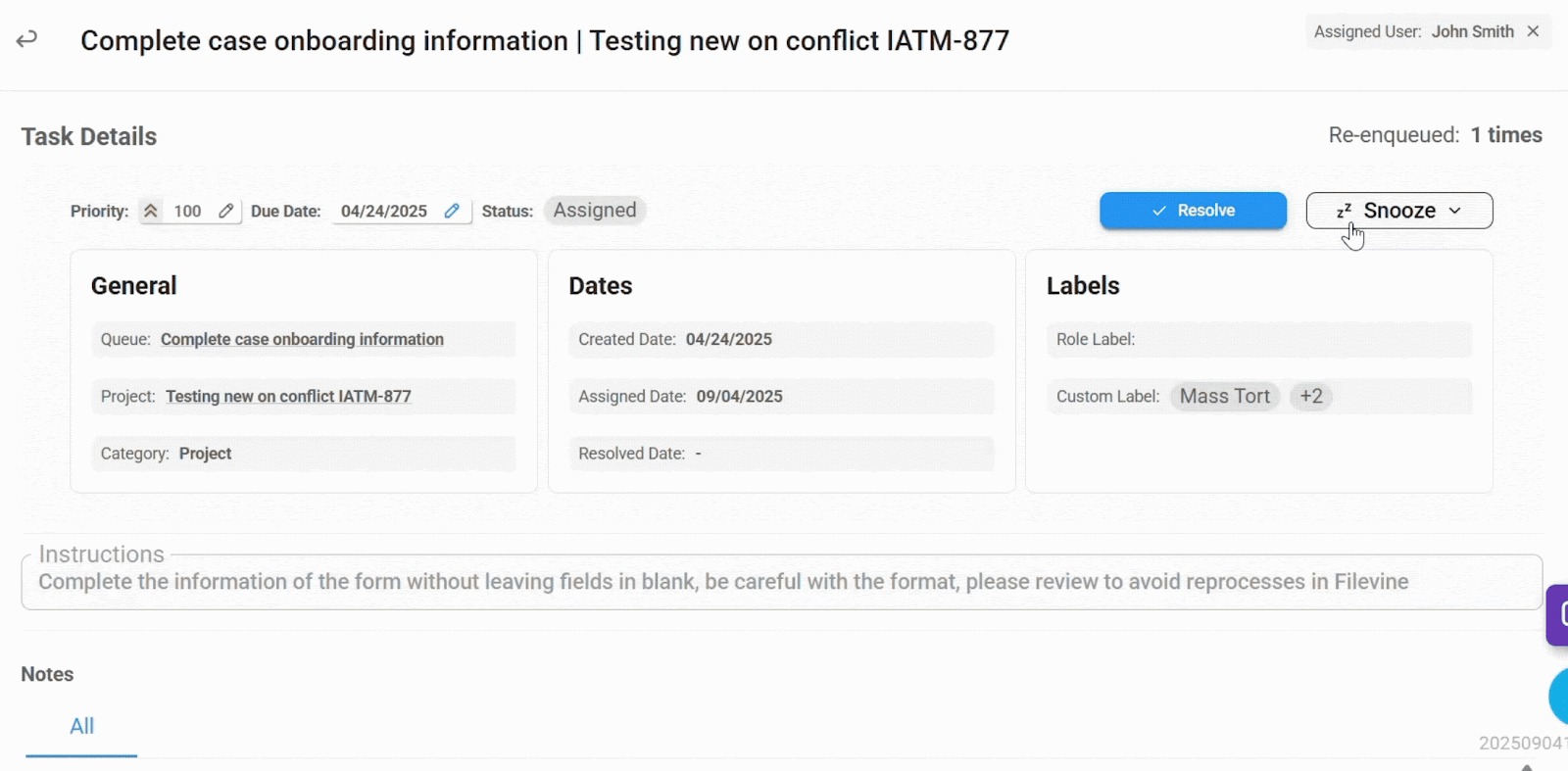 Users with ATM User, ATM Manual Task User or ATM Overseer role can snooze assigned tasks only.