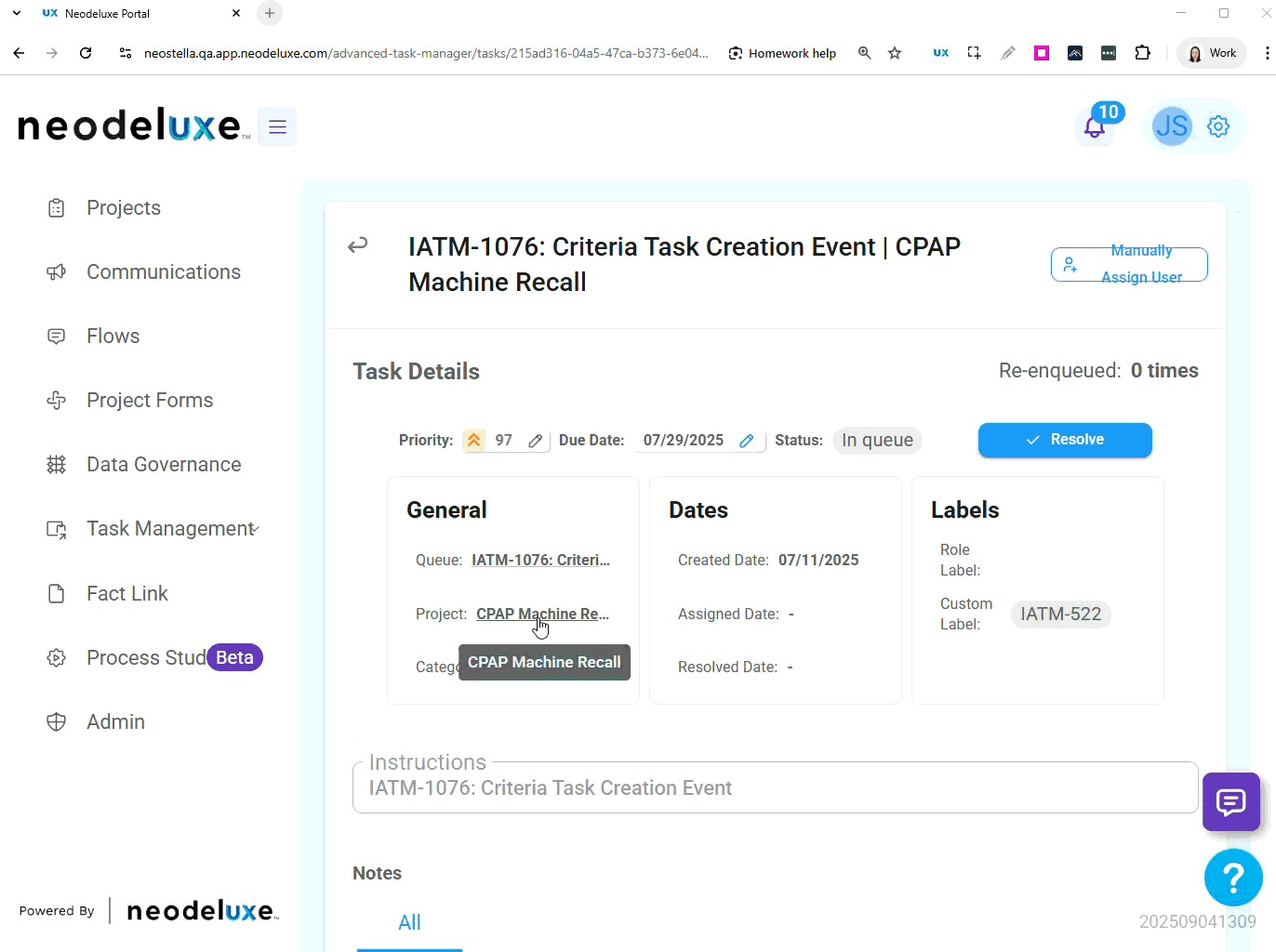 To open the queue that originated the task, follow the steps: