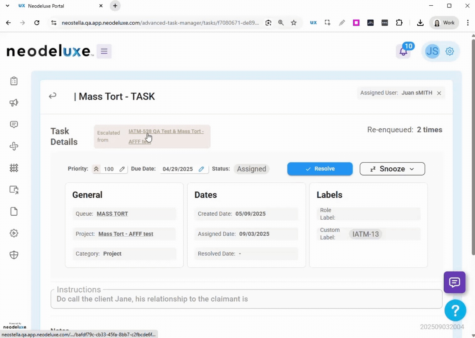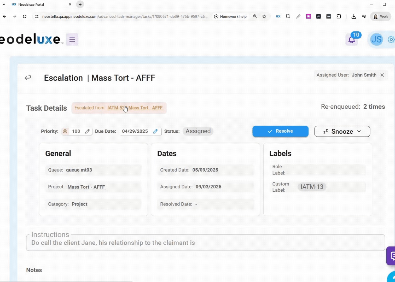 - Click the Escalated from link to open the original task before the escalation in a new tab.