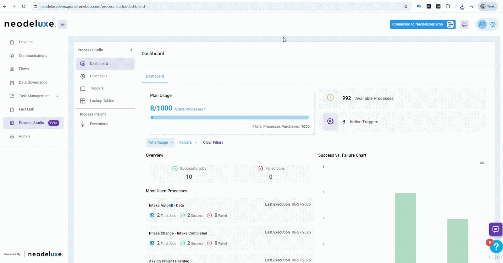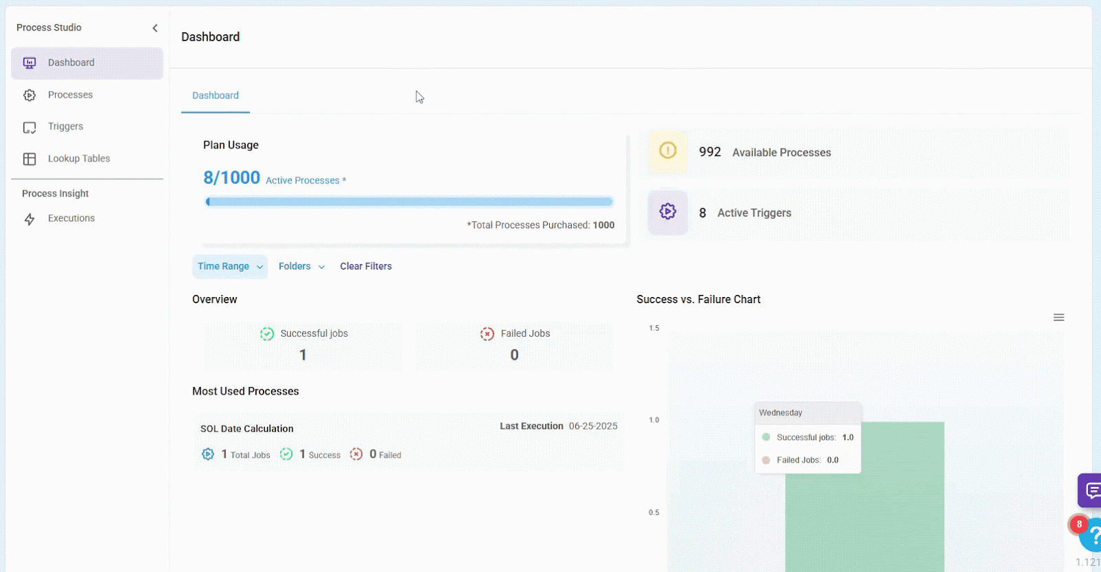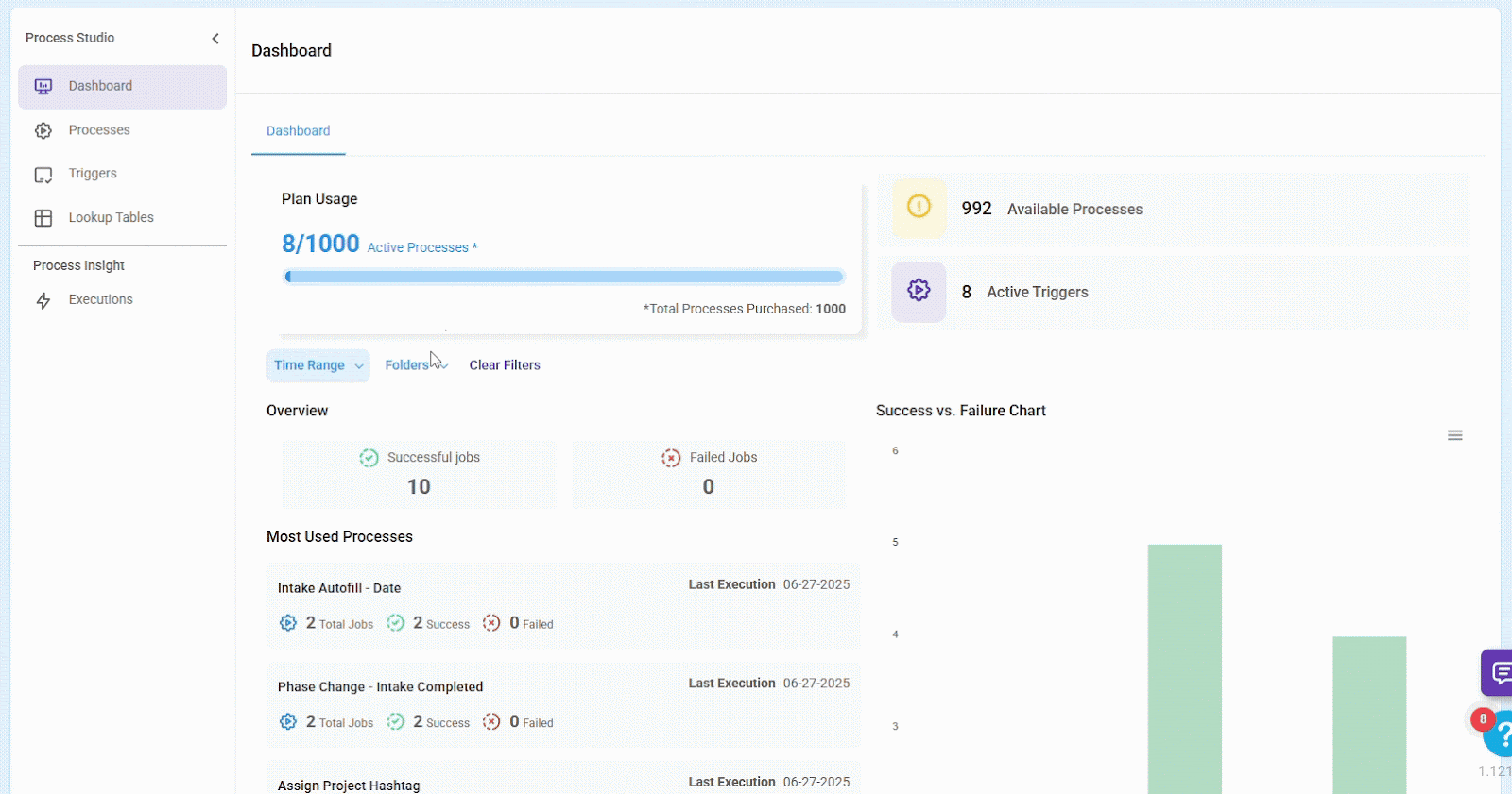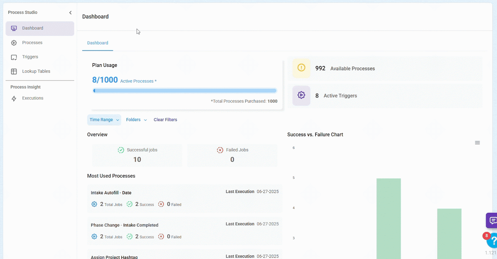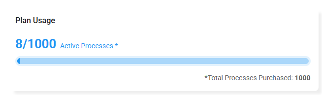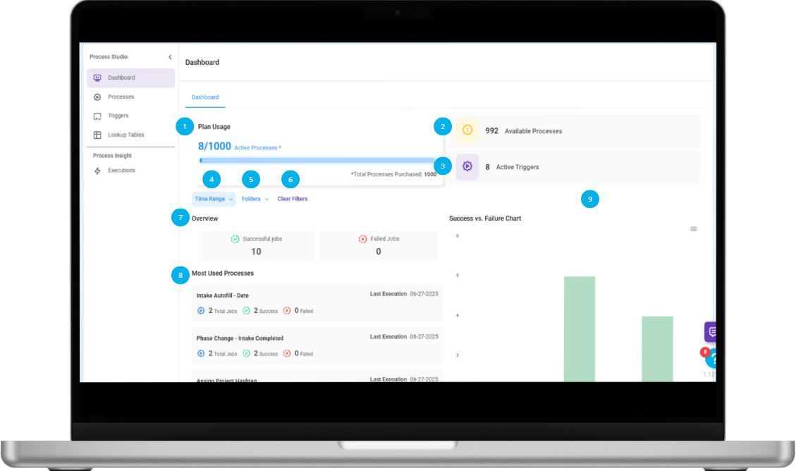 The Dashboard menu provides administrators with key performance insights into process activities. It offers a comprehensive overview of how processes are functioning, their success rates, plan usage, available remaining processes, and other valuable data points for management purposes.