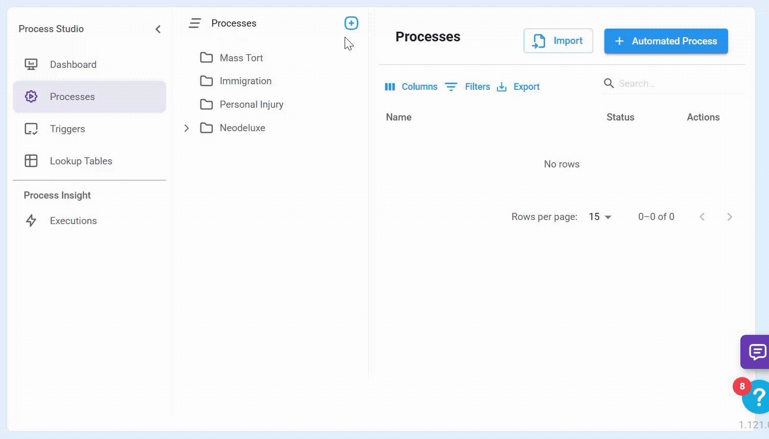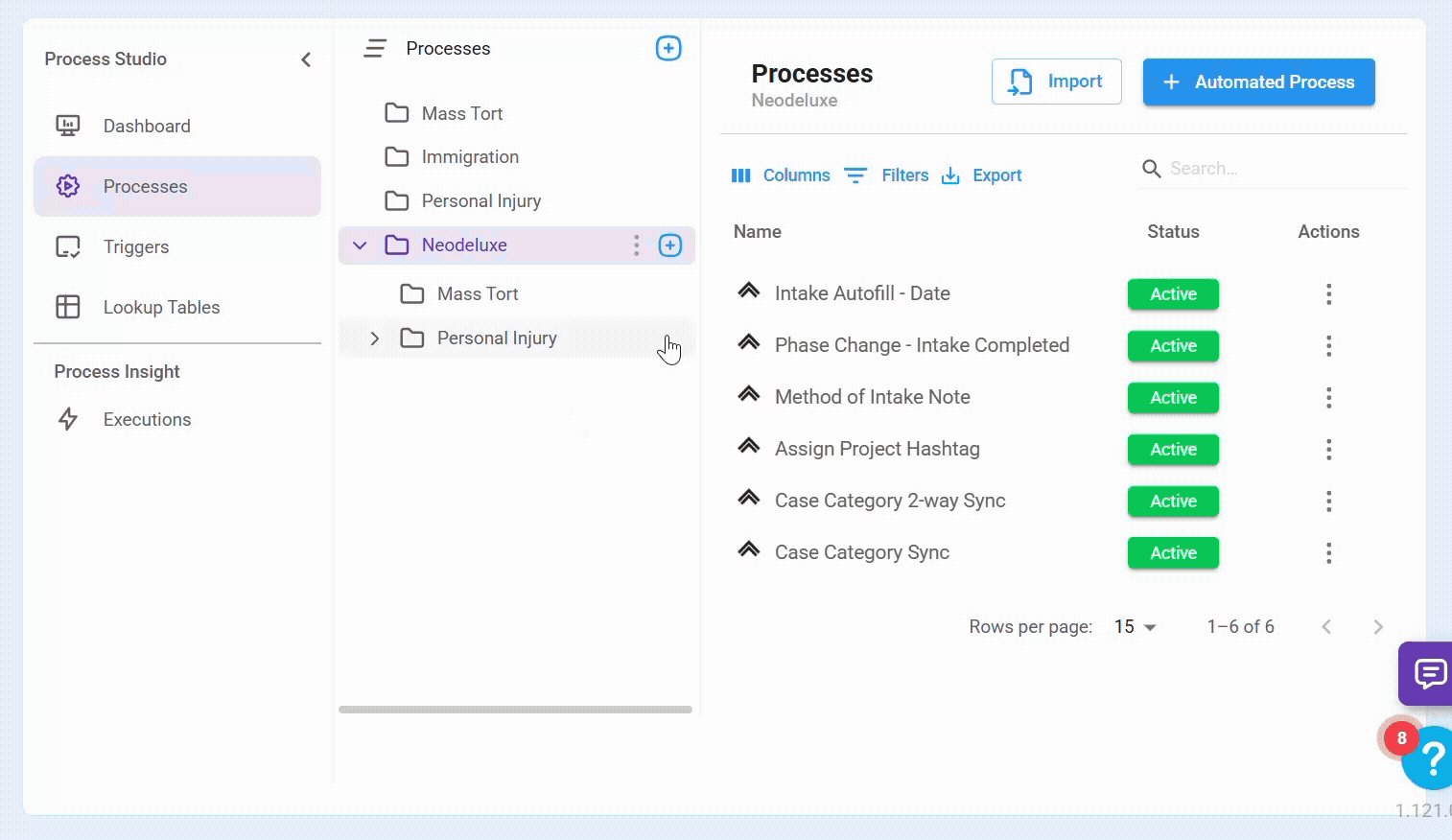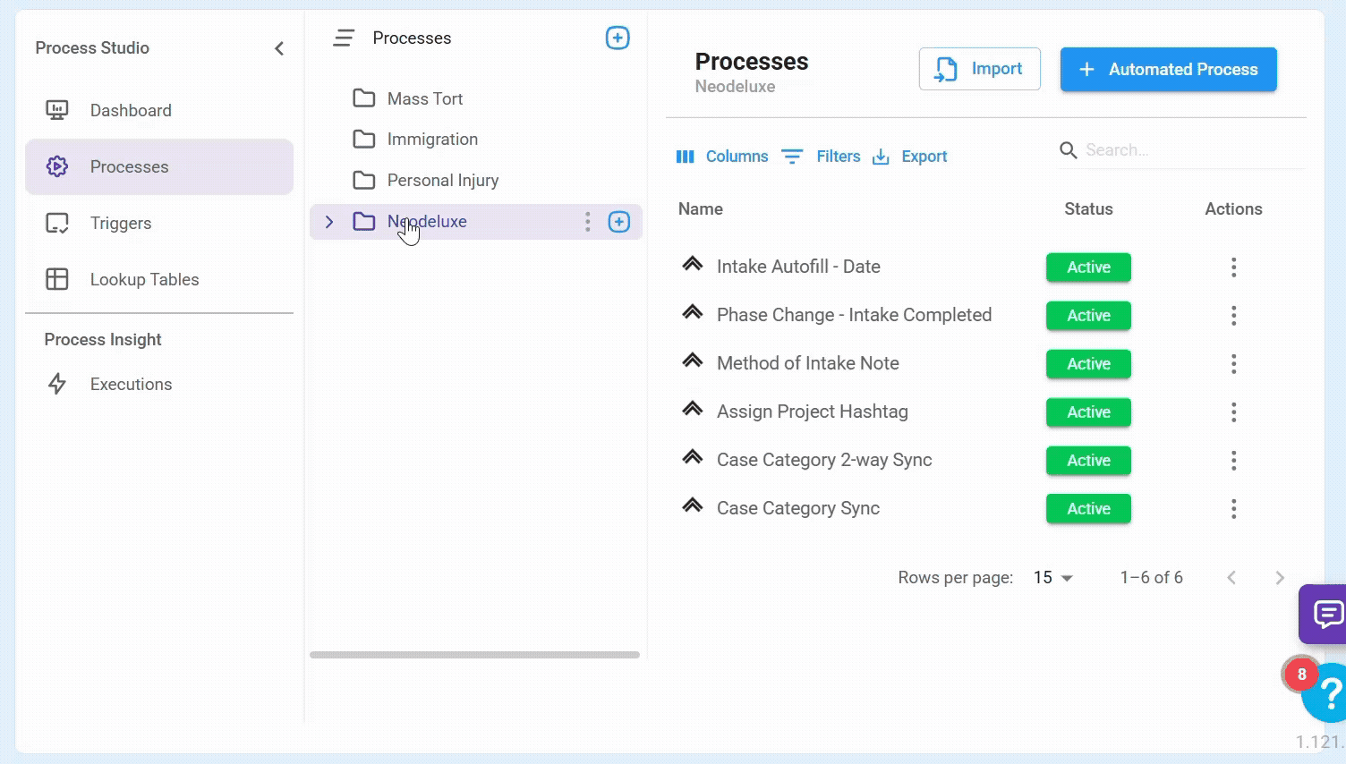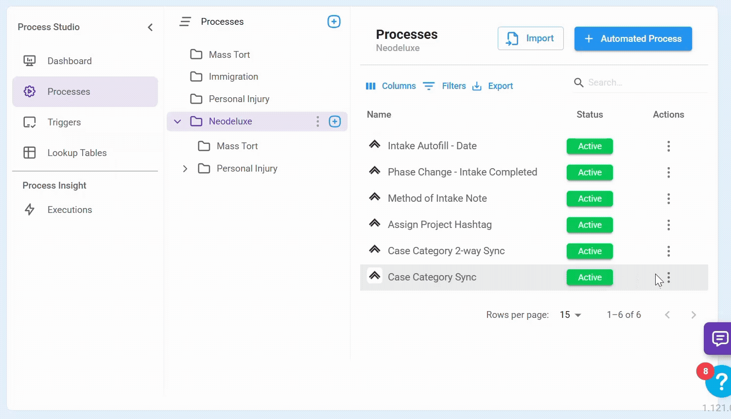 The Processes menu is the central hub for managing your automated workflows. Here, you can create, edit, publish, deactivate, import, export, and delete processes.
