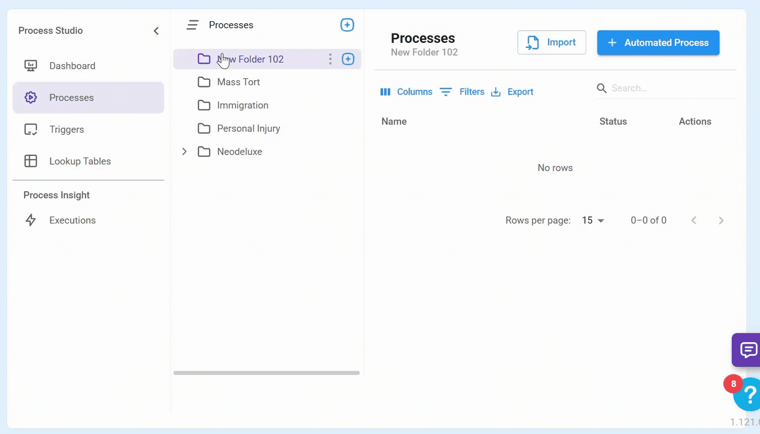 Folders, along with all their processes, can be moved using drag and drop. This feature allows you to organize folders by nesting them or relocating them as needed.