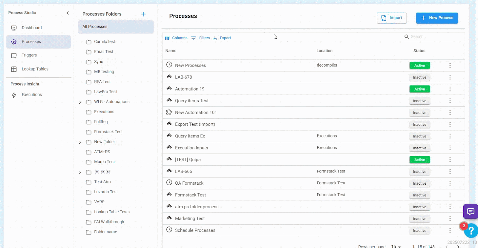 The Location column displays the folder where the process is stored along with the full path to reach it. You can click on the path to quickly access the folder in Process Studio.