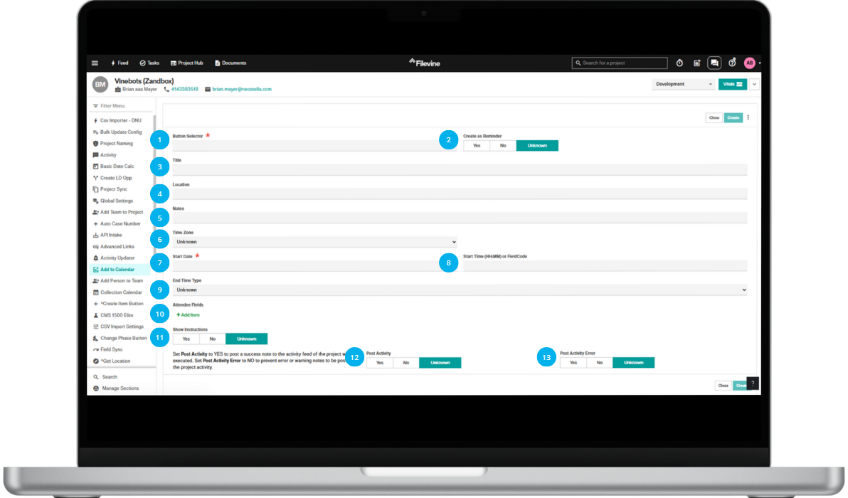 A Filevine Admin configures a button within a project template that contains forms. When a user clicks the button, the automation uses the data in that project to create a calendar appointment or reminder.