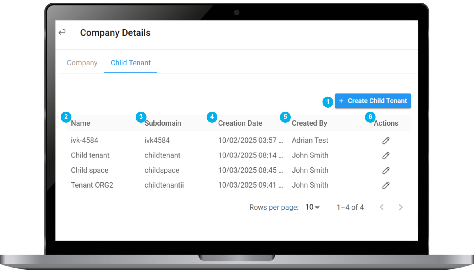 Child Tenants are logically isolated sub-tenants within a multi-tenant system, created under your Parent Tenant, which is used to represent separate organizational units with independent resources, users, and configurations. Such units inherit the same type of license as the Parent Tenant.