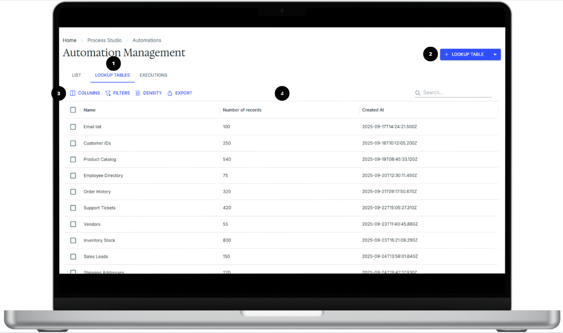 This feature evolves from traditional spreadsheet-based references, offering a lightweight database directly inside Automations. Many automated workflows rely on Lookup Tables to enrich data, validate values, or correlate records using shared identifiers.