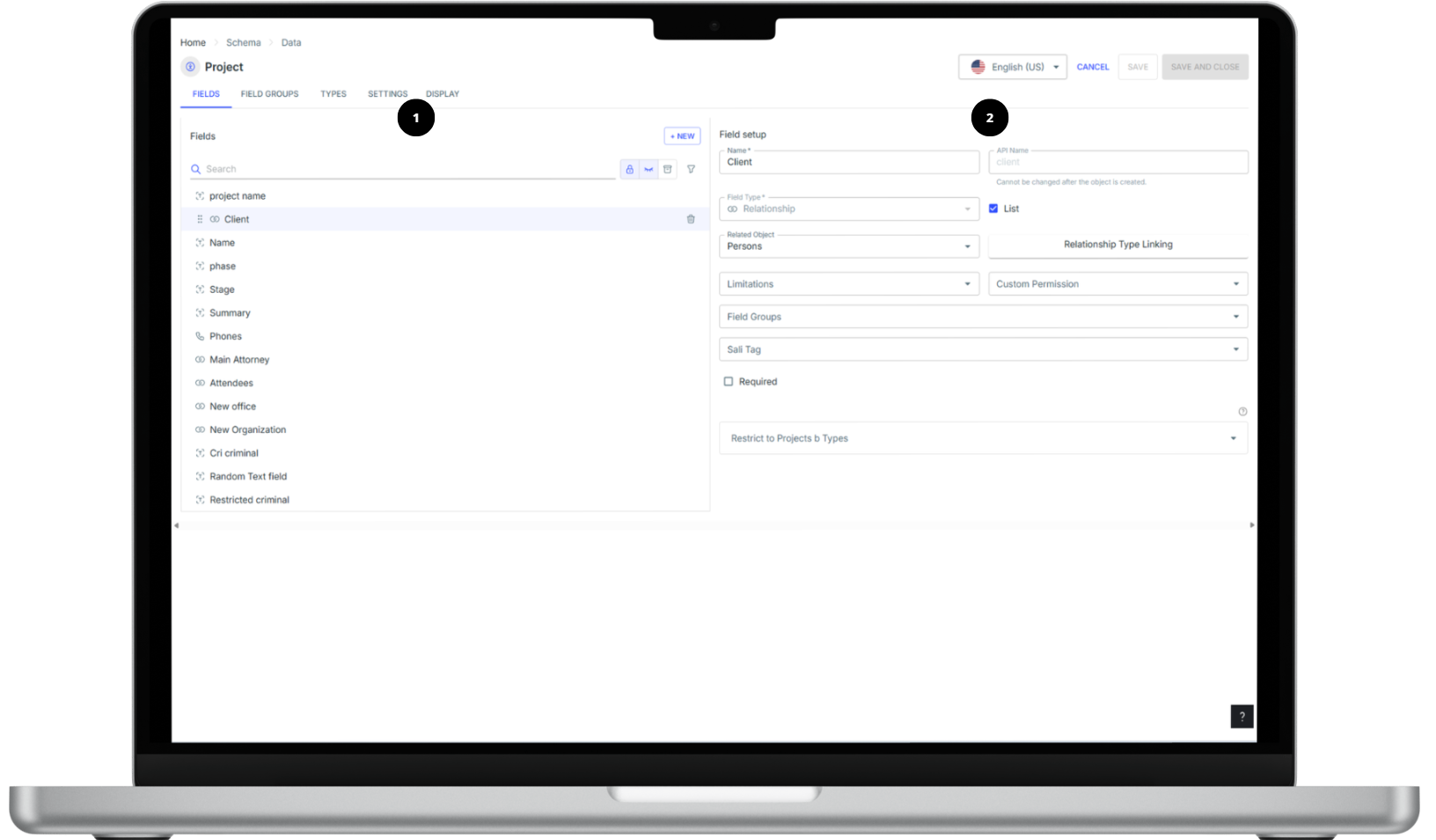 6. Field Groups dropdown 7. Sali Tag 8. Required checkbox 9. Include In Quick Search checkbox 10. Restrict to {Object} Types list |