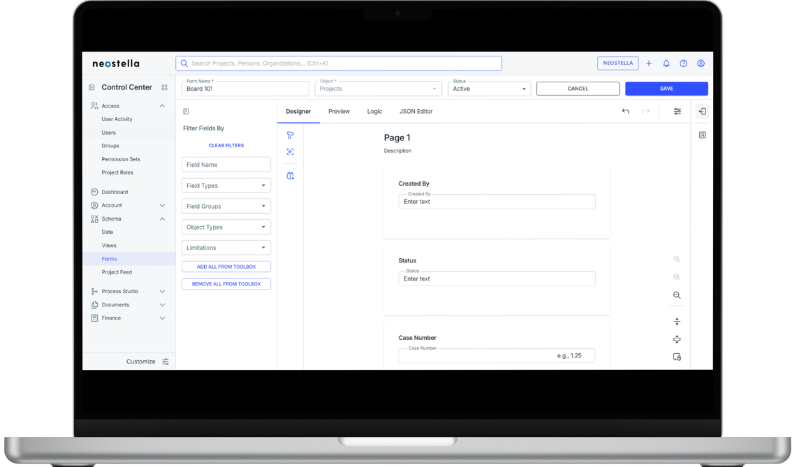 Every interaction a user has with structured data, such as entering values, reviewing case details, updating records, takes place through a form. Because of this, Forms are one of the most essential schema tools on Neostella.