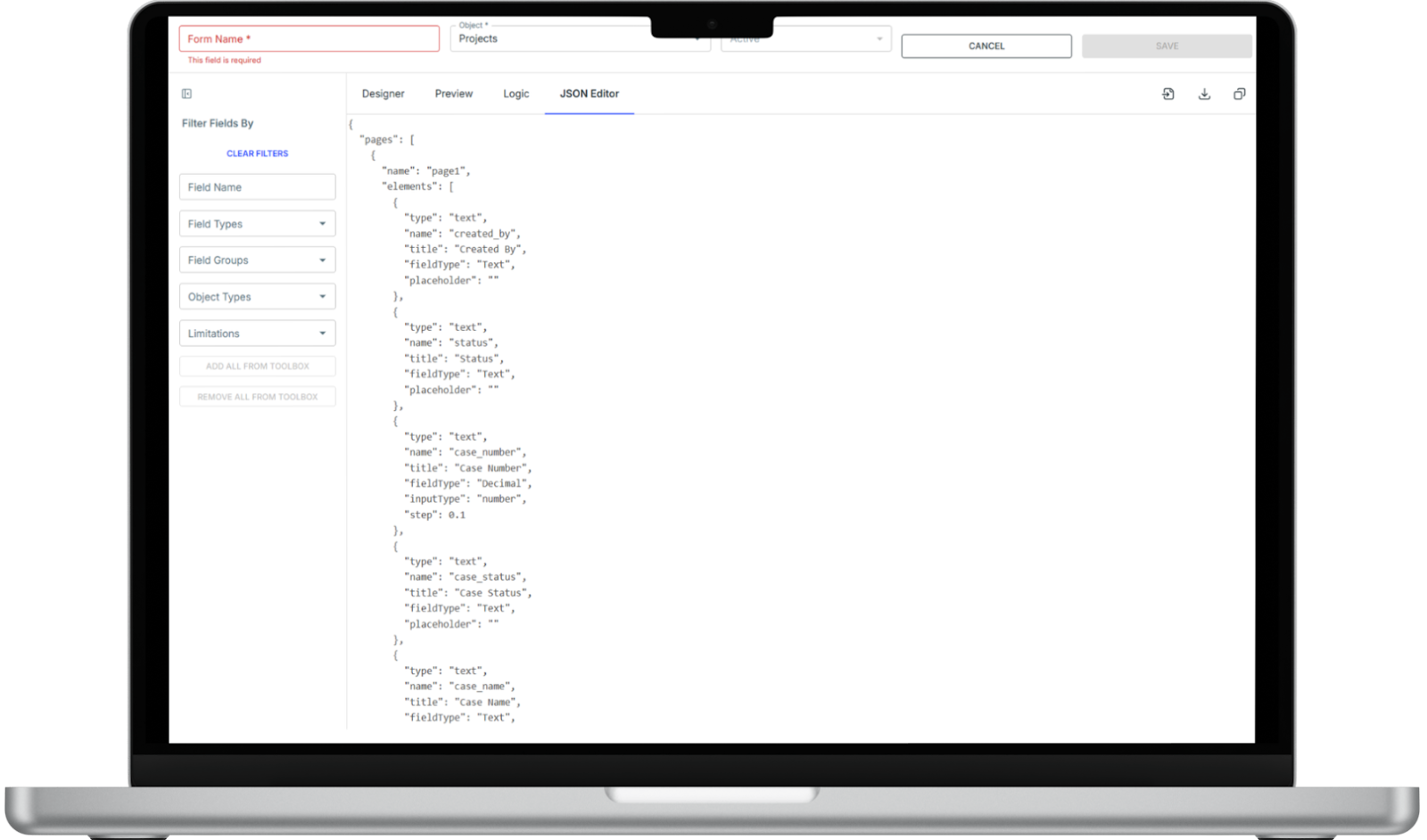 For most form creation and management tasks, the Designer, Preview, and Logic tabs are sufficient. The JSON tab serves as a technical reference, not a configuration workspace.
