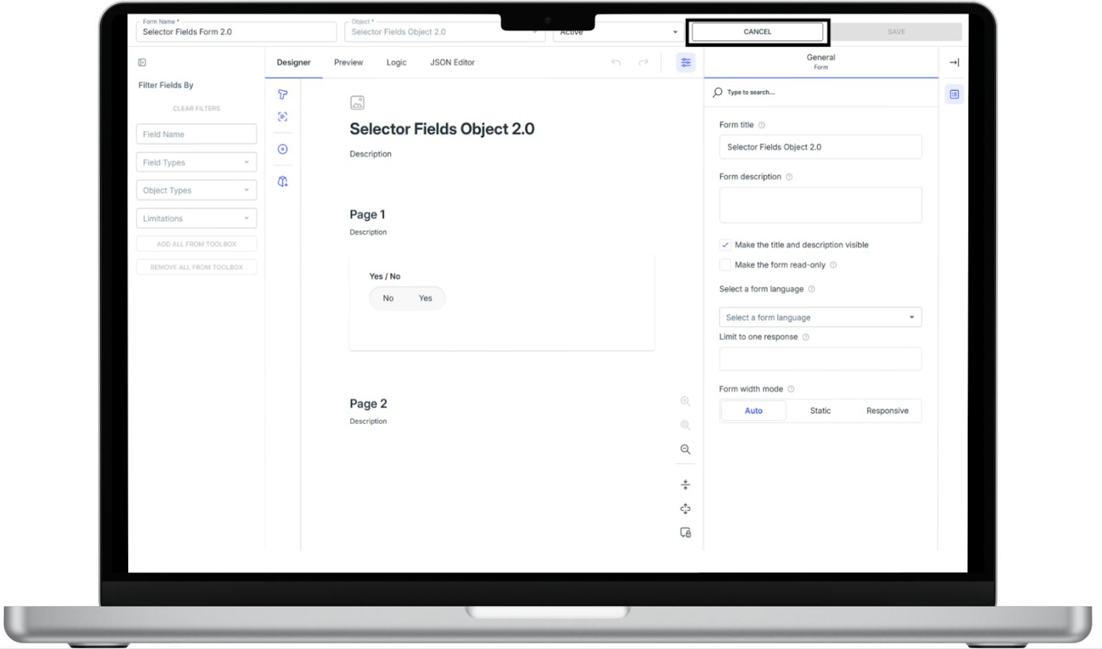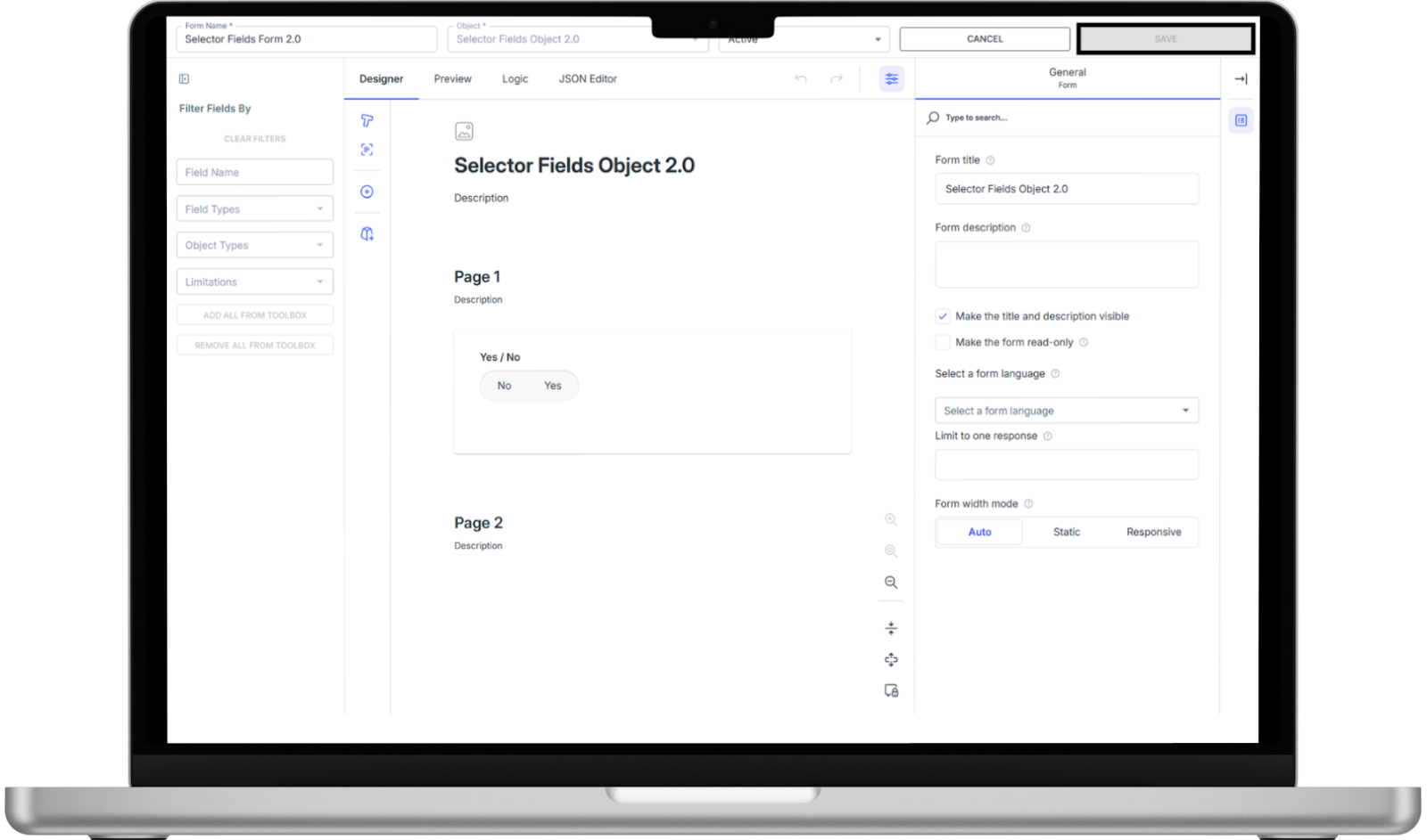 The Form Editor is the central workspace where admins create, configure, and maintain forms. From here, it is defined the form’s name, data source, status, and structure, and access the Designer, Preview, Logic, and JSON tabs.