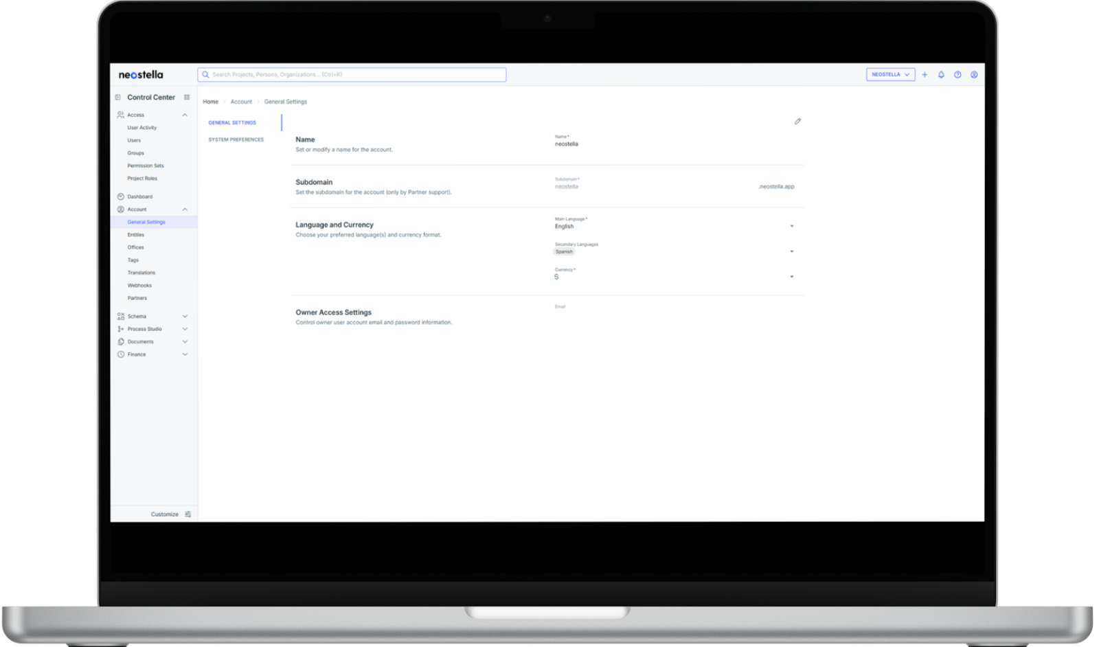Its purpose is to support platform access and routing.The subdomain is unique across Neostella; it is not repeated. Because of its foundational role, the subdomain cannot be edited from the General Settings tool.