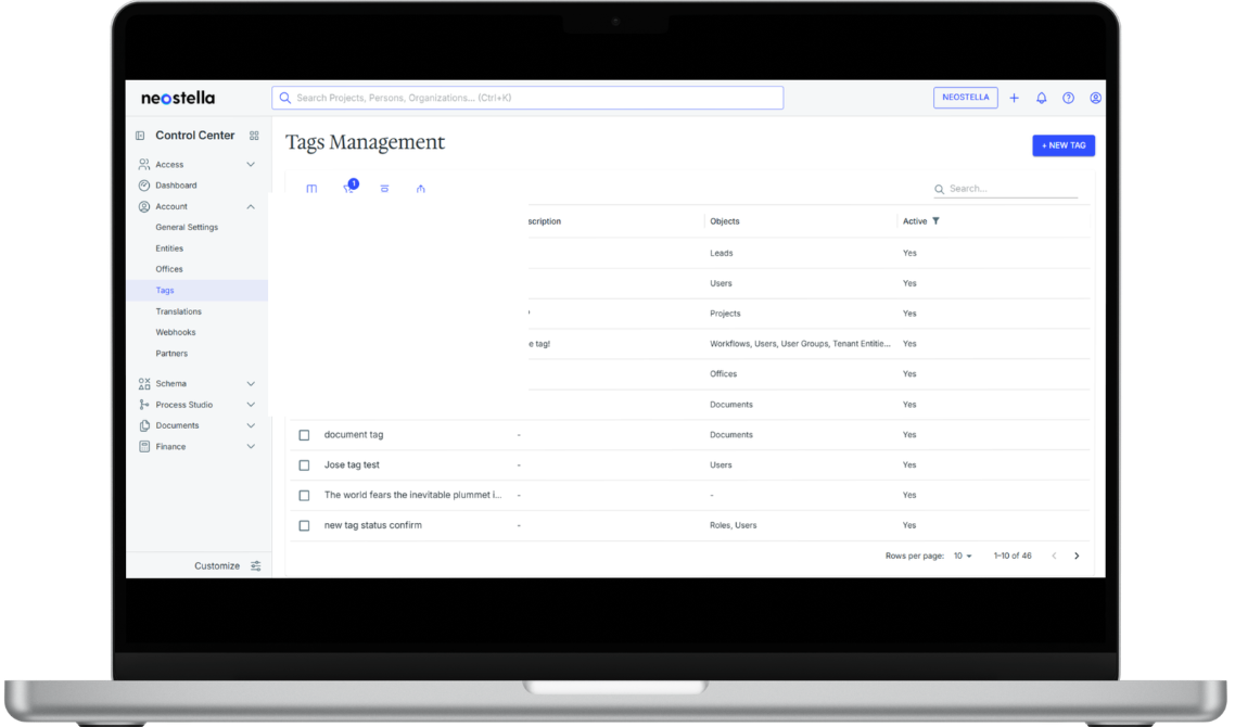In Neostella, a tag is a simple label consisting of a key and an optional value that adds context to a resource without changing the underlying data. Firms can apply tags to objects, organizations, people, users, groups, permission sets, automations, workflows, among other supported resources.