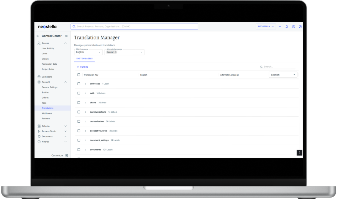 The Translations tool allows admins to manage the language used across the Neostella user interface. Through this workspace, admins can define the primary and secondary languages for the account and translate key system terms and messages used throughout the Control Center and the Cases workspaces.
