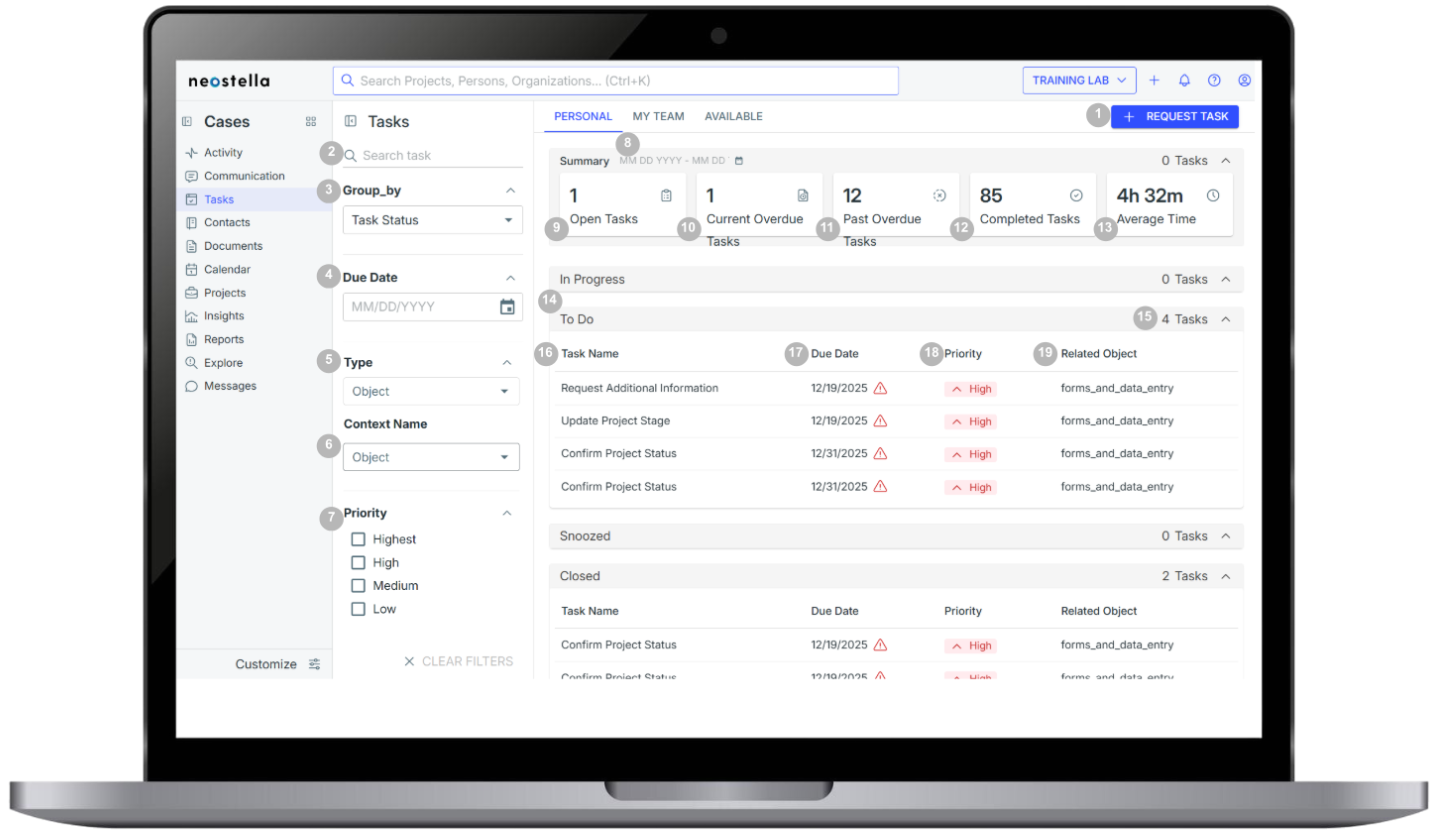 Collapsible/expandable sections containing a table of tasks grouped by status: In Progress: The user is actively working on the task. To Do: Tasks the user still needs to manage. Snoozed: The user has temporarily postponed the task until a specified date and time. When the snooze period ends, the system automatically restores the task’s previous status. Closed: The user has completed the task. A resolution code indicates how and why it was closed. Completed: The task was resolved. |