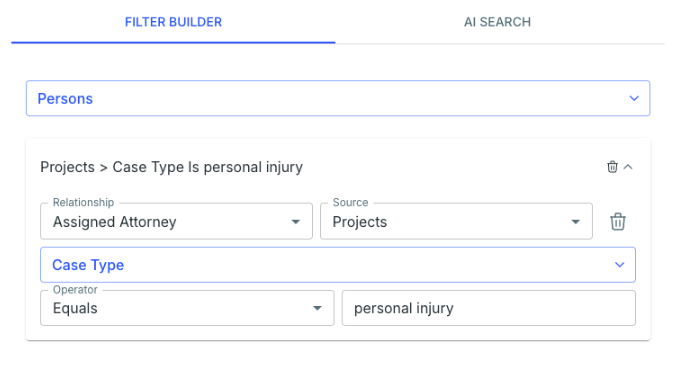 - Then select the Relationship between the Persons and Projects. In this case we need to filter the Assigned Attorneys.