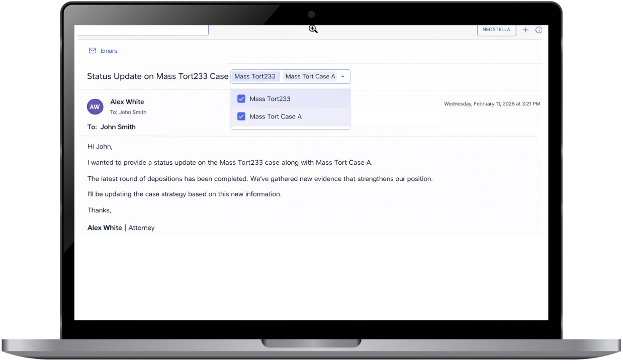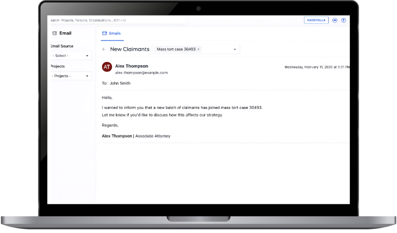Each email in Neostella can be linked to one or more Projects. This helps keep communications organized under the correct case or context. If an email is linked to the wrong Project(s) or is not linked to the correct ones, users can easily add or remove Project(s) associations as needed.